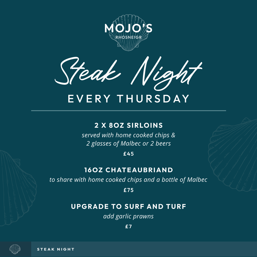 Fantastic offers on our Sirloin and Chateaubriand steaks every Thursday evening, all served with a Malbec or choice of beer.